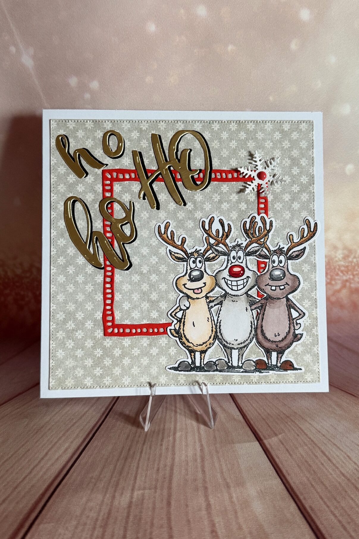 Voici ma dernière création : une carte festive avec des rennes chantants, colorisés avec des feutres Copic, le papier vient de chez Action.